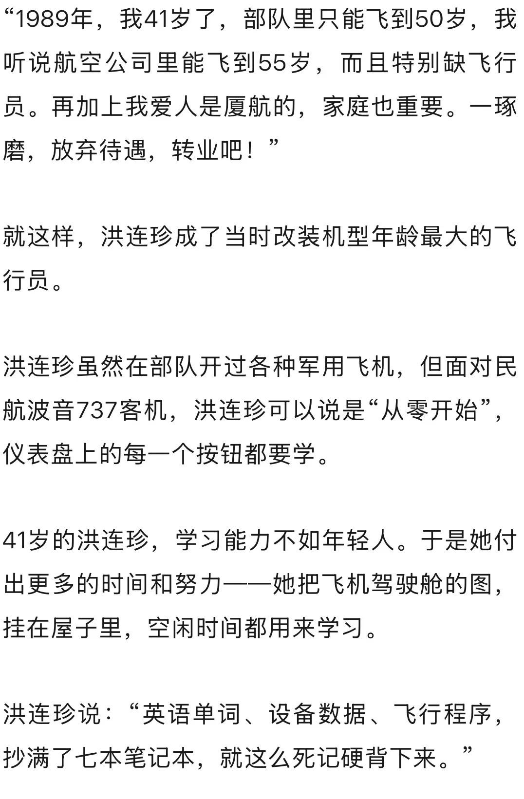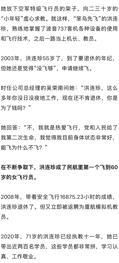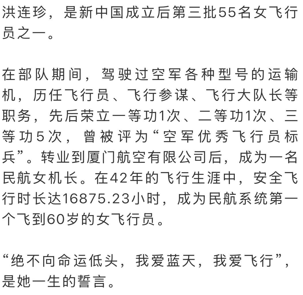 往事历历在目。从17岁到76岁,洪连珍把大半生献给了飞行,她的真诚、热情、认真、好学、顽强和乐观,影响了很多人。她曾说:“绝不向命运低头,我爱蓝天,我爱飞行,这是我一生的誓言。”