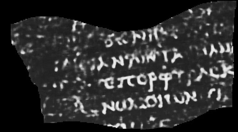 法里托开发出了一种机器学习算法,在卷起的纸莎草纸上检测到了几行希腊字母,其中包括 πορ j υρα(porphyras),意为 " 紫色 "。Farritor 利用表面纹理的细微差别来训练神经网络,并突出墨迹。