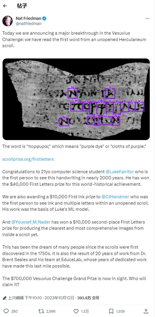 IT 之家 10 月 14 日消息,现年 21 岁的大学生、前 SpaceX 暑期实习生卢克法里托(Luke Farritor)利用人工智能技术,成功破译赫库兰尼姆古卷中的一个单词,获得了 4 万美元的 First Letters Prize 大奖。