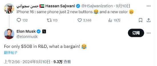 一位 X 用户在社交媒体上评论说,iPhone 16 基本上是同一款手机,只是添加了两个新按钮和一种新颜色。马斯克用讽刺的口吻回应道:" 只有 500 亿美元的开发费用真是太划算了!"