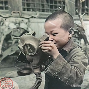 一名小孩正在玩耍从日军手中缴获的防毒面具,这个小孩子只是觉得这个东西长相怪异,把它当玩具玩耍。