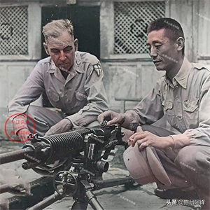 中国远征军第20集团军的美军联络官与刘召东将军正在查看从日军手中缴获的九二式重机枪。