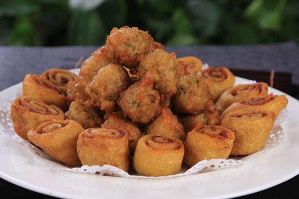 咯扎算是极具特色的唐山美食了,别的地方很难吃到它。它是用豆皮裹上肉馅卷成饼子的形状,再切成块,用油煎炸至金黄色。