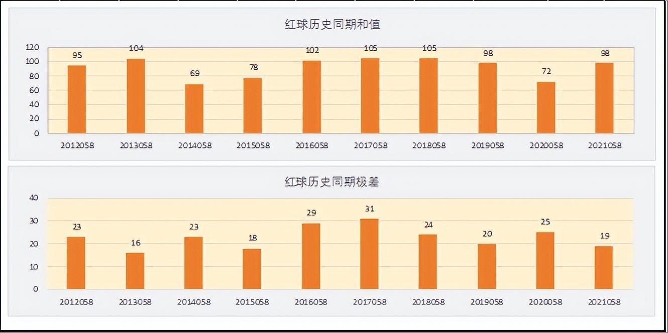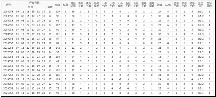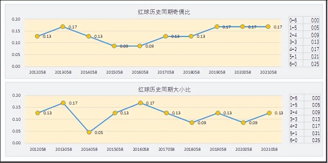历史同期21058期红球奇偶比为4+2,大小比为3+3。