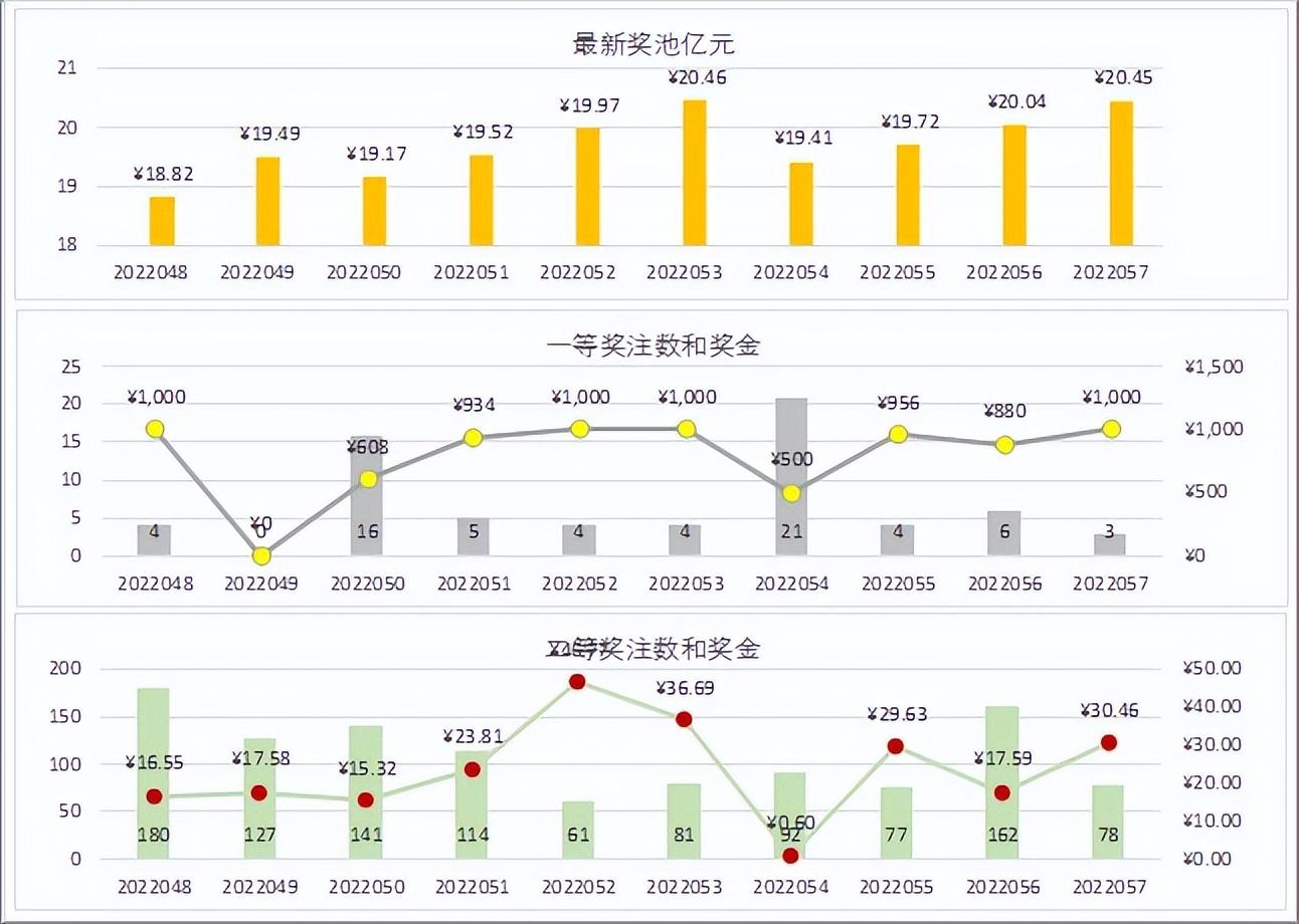 1、如上图,双色球22057期销售额及一二等奖中奖注数和金额,奖池的大小预示着下期中奖数和奖金的大小,奖池越大,下期中奖的机率会越高。