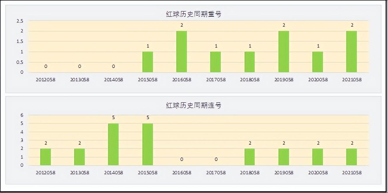 8、如上图,双色球22058期红球历史同期重号和连号图,查看历史同期红球重号和连号的走势。