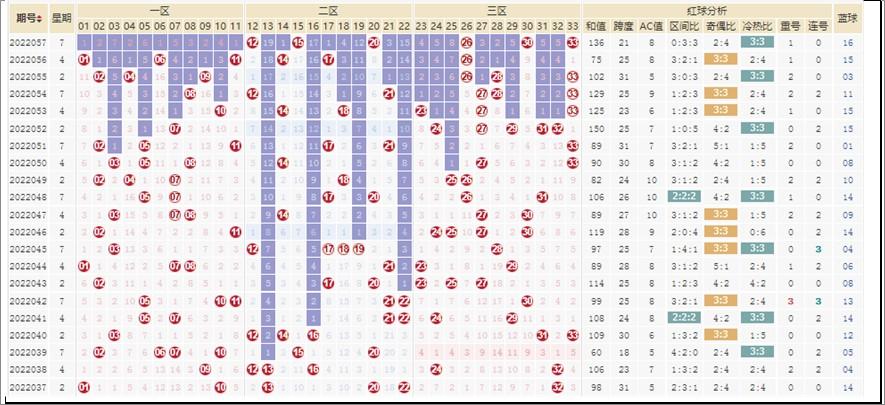 4、如上图,双色球22058期33个红球数字专家预测,通过专家对红球的预测,了解红球数字的关注程度。