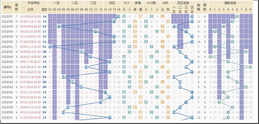 3、如上图,双色球22057期蓝球走势图及蓝球分析,查看大小比、奇偶比、冷热比和振幅,预测蓝球区间锁定蓝球数字。