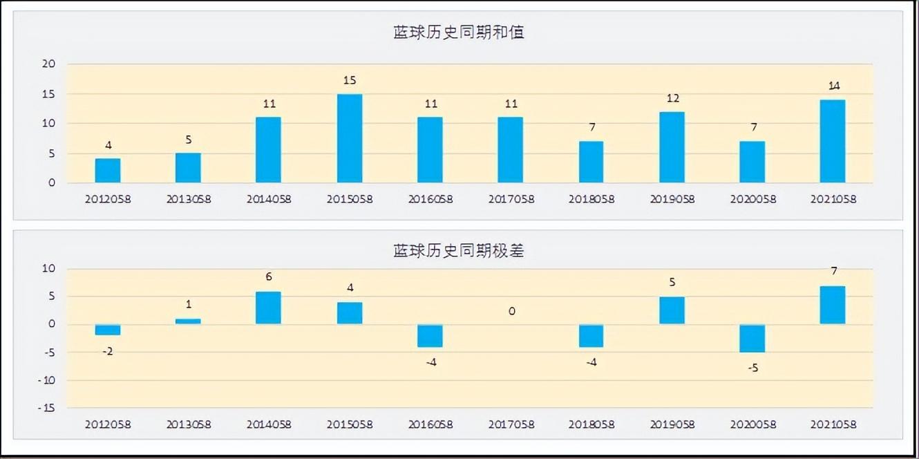 10、如上图,双色球22058期蓝球历史同期和值和极差图,查看历史同期篮球和值和差值的走势。