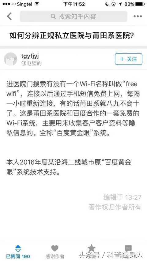 这个广告多半是打给他们的。莆田系医院得到了患者的信息,更容易骗钱,百度也在莆田系医院那里多赚了一笔钱。皆大欢喜。唯一被蒙在鼓里的可能就只有前去就诊的消费者了。