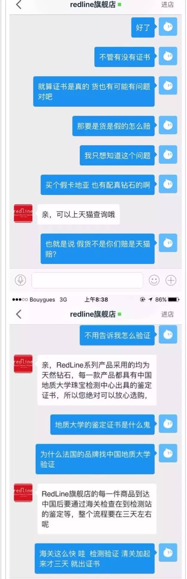 可以看到客服明显的避开话题,压根没有提到的物品真假一事。你说我们的都是真货就...是真货啦?当小伙伴A再追问的时候不知道是信号问题还是被拉黑了,反正信息已经发不出去了。