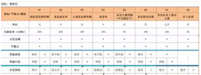 K1销售额,K2毛利,K3充卡现金收入,K4变动费用率,K5人效,K6客户线上评分,K7人均消费额,K8人才流失率,这些跟KPI要进行区别,八千块钱的工资分解到每一个K指标,然后找到过去的平衡点。