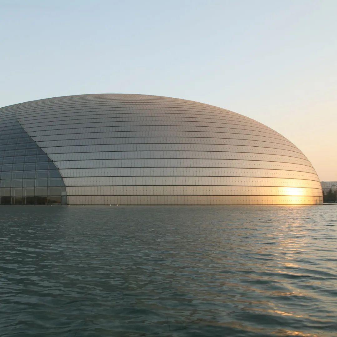 国家大剧院由法国建筑师 Paul Andreu 设计,整个建筑为一个巨大的圆顶结构,位于人民大会堂旁边的湖中。