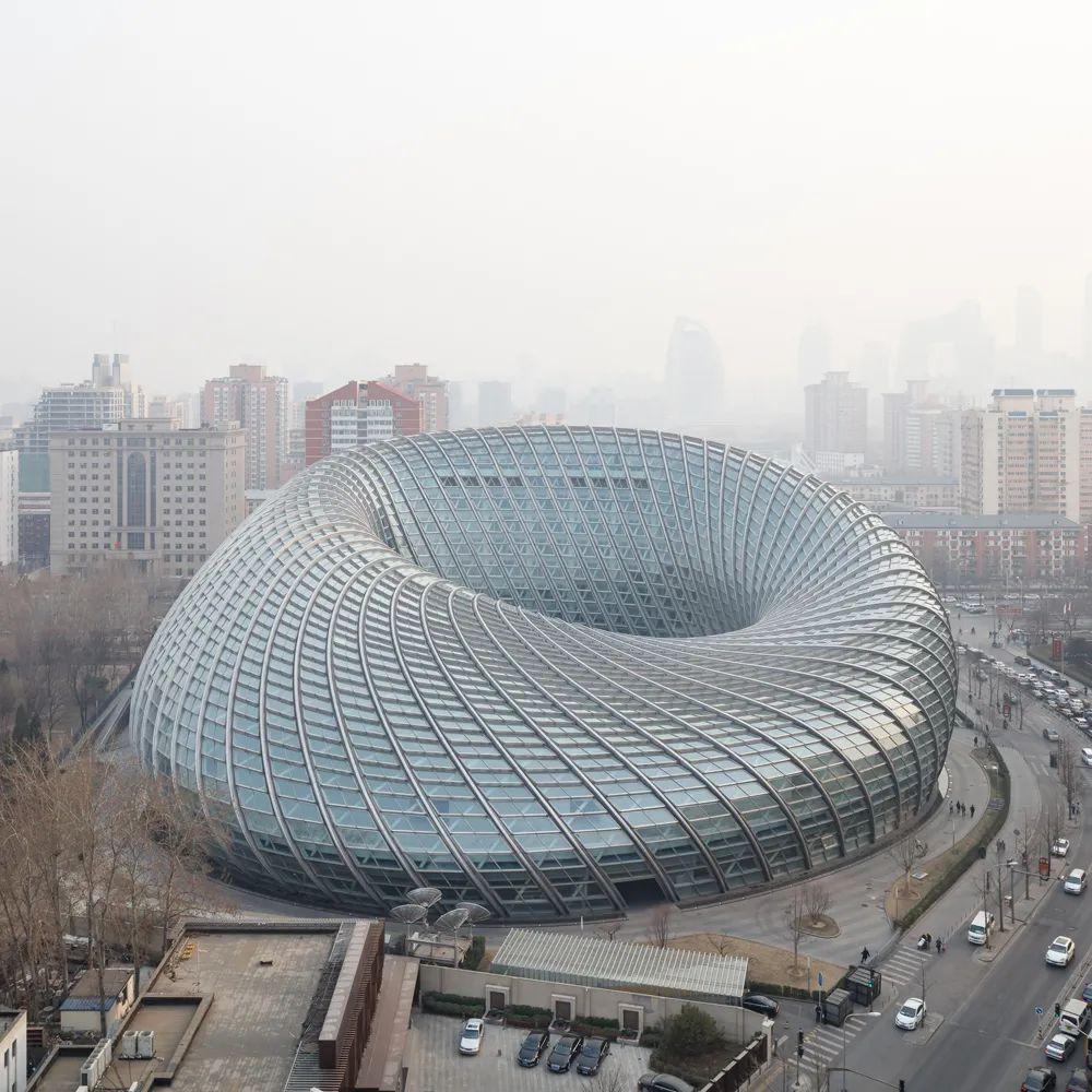 这座拥有格子状幕墙的环形建筑是凤凰国际传媒的总部,由北京建筑设计研究院设计,其扭曲的形状被比作莫比乌斯环。