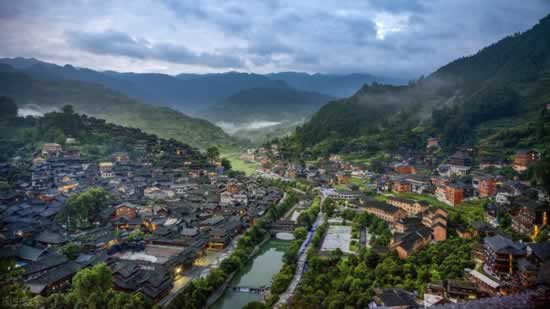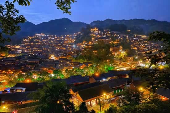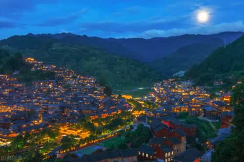 西江千户苗寨是全世界最大的苗族聚居村寨,上千座苗族特色的吊脚楼绵延分布,十分震撼。错落的灰瓦木楼,悠长的石板古巷,这里的夜景超美,万家灯火,犹如漫画里的场景。