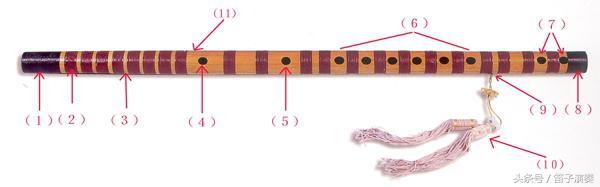 (7)基音孔 (8)后镶口 (9)助音孔 (10)飘穗 (11)笛塞