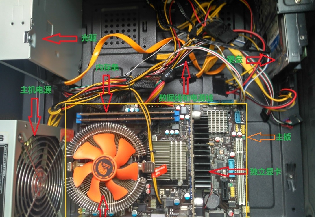 第一步、打开电脑主机侧盖,你会看到大致如下的结构
