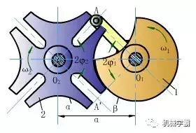 驱动轴旋转一周,被驱动圆盘交替驻留两次,旋转两次。