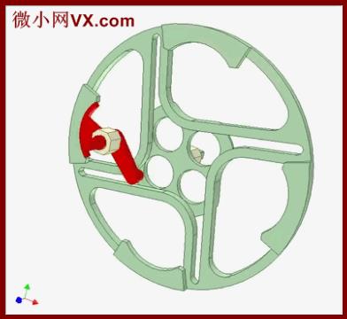 如下图所示,主动拨盘上的圆柱销进入槽轮上的径向槽以前,凸锁止弧将凹锁止弧锁住,则槽轮静止不动。圆柱销进入径向槽时,凸、凹锁止弧刚好分离,圆柱销可以驱动槽轮转动。当圆柱销脱离径向槽时,凸锁止弧又将凹锁止弧锁住,从而使槽轮静止不动。因此,当主动拨盘作连续转动时,槽轮被驱动作单向的间歇转动。