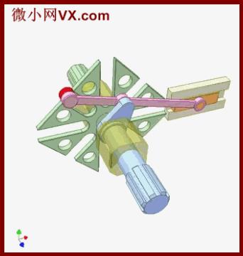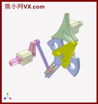 粉色滑块上的销在绿色曲柄和橙色曲柄的凹槽中滑动。