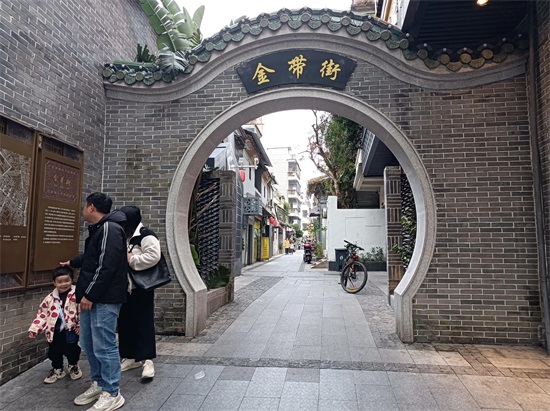 金带街建于明洪武二十二年(1389),明代以前,这里还是惠州城外的居民点,至今已有600多年的历史。街道东西走向,长约300米,宽约4米。两旁的建筑多为明清时期的风格,保存完好。