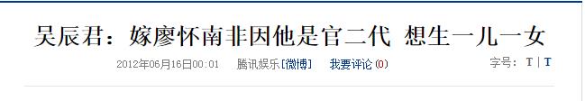 据悉,廖怀南也算是官二代及富二代了,曾祖父母都是曾经的革命先烈,父亲是第十一届全国政协副主席,母亲曾任中央芭蕾舞团团长,如此显赫的家庭背景当然要低调了。所以结婚后的吴辰君听从丈夫安排,不需要长时间的外出工作,演戏亲热戏也不能太大胆,自然而然的吴辰君就不再演戏,安心过上了相夫教子的生活。