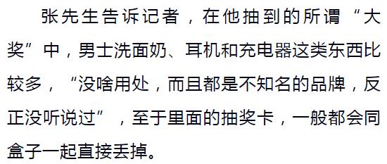 张先生告诉记者,在他抽到的所谓“大奖”中,男士洗面奶、耳机和充电器这类东西比较多,“没啥用处,而且都是不知名的品牌,反正没听说过”,至于里面的抽奖卡,一般都会同盒子一起直接丢掉。