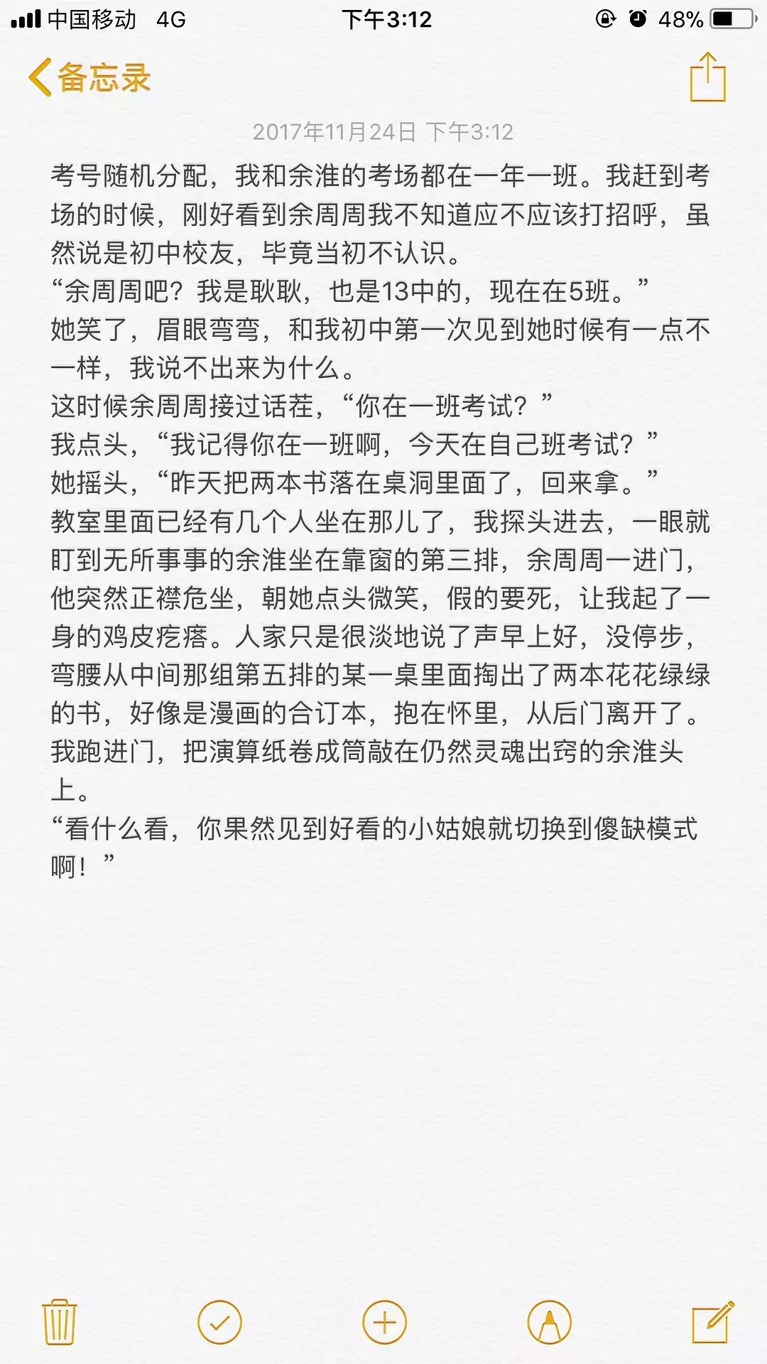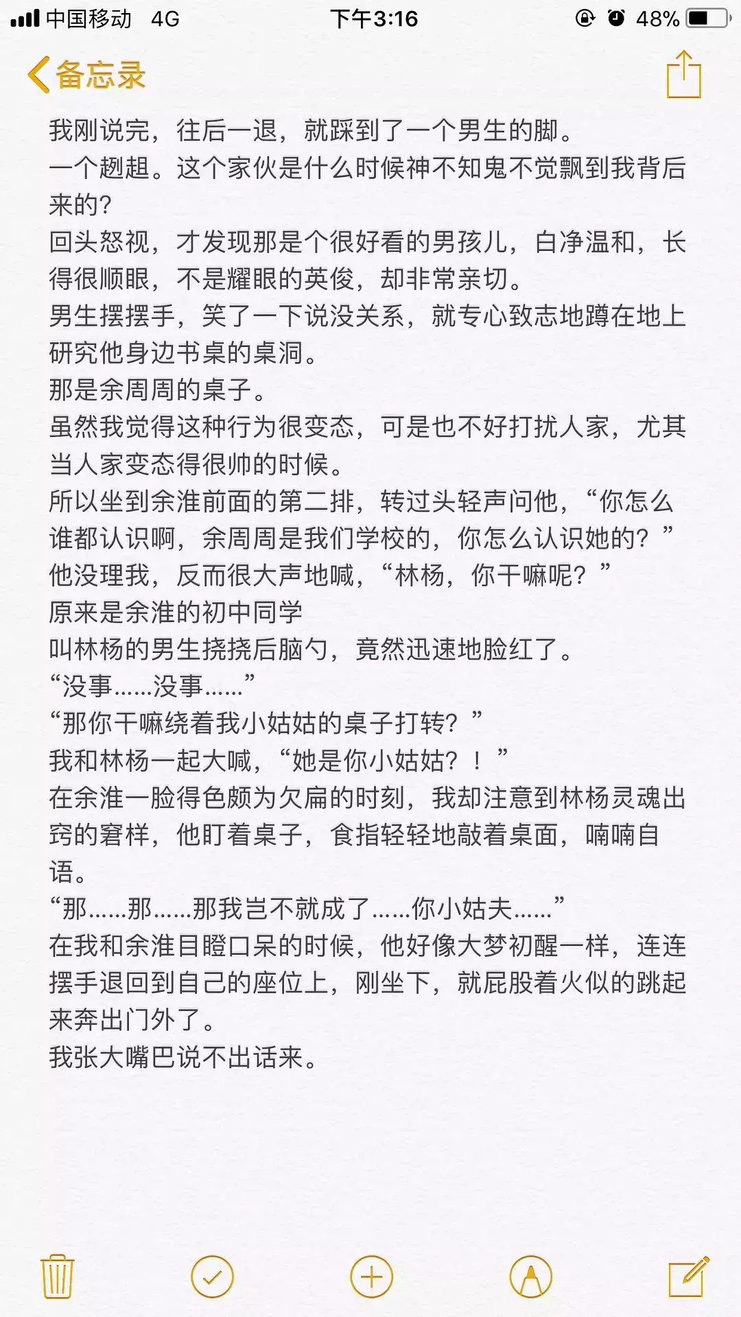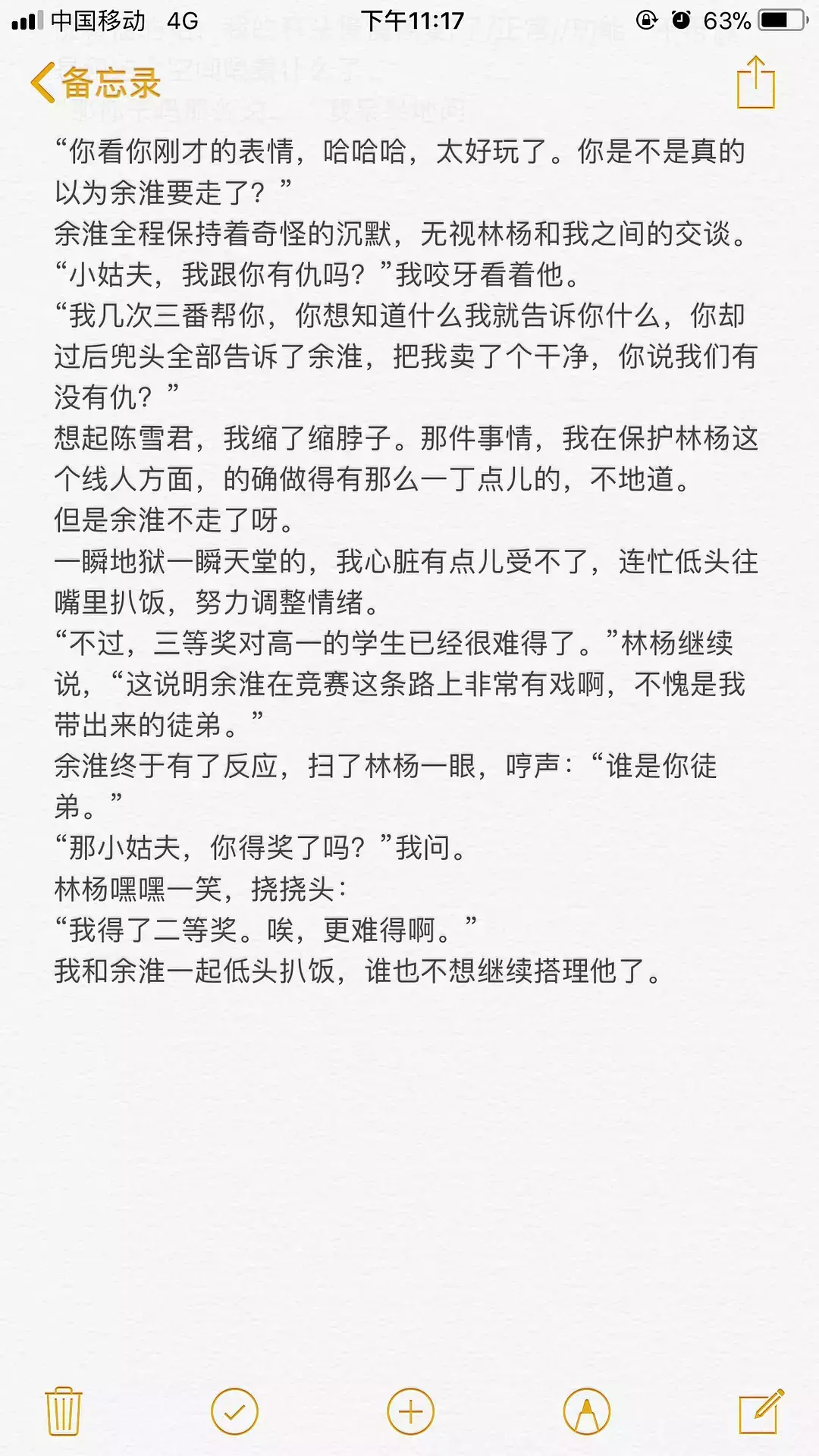 这一段有点长,而且没有周周,本来不想贴的,但是我挺喜欢这段的,调皮的,带点蔫坏的,又有点得瑟的林杨,还有彼此喜欢着的耿耿和余淮,让这段情节十分出彩,所以,还是贴出来了。希望你们看的开心