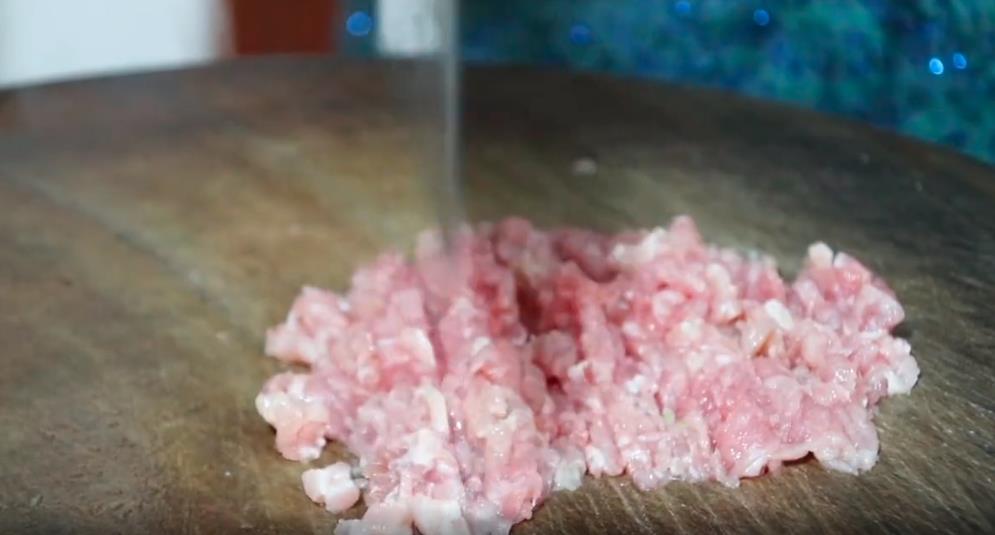 4. 准备一点瘦肉,给它切成肉片,然后剁成肉泥。