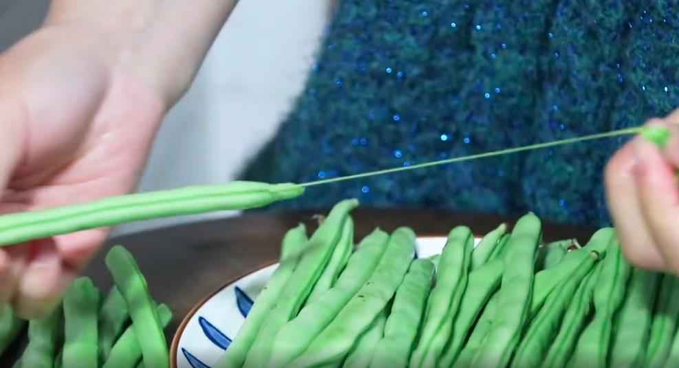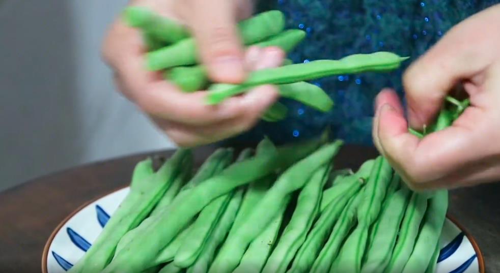 2. 买来的四季豆我们需要处理一下。四季豆的筋需要给撕掉,处理的方法很简单,只需要把四季豆的一头给捏住,然后掰断就可以轻松抽出来了。一般比较嫩的四季豆吃起来就没有什么太多的筋。