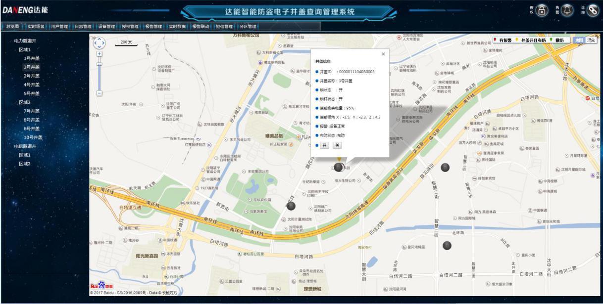 可根据不同的报警类型进行设置告警联动的设备类型,目前支持声光报警联动以及短信报警信息的发送;将井盖处于倾斜角度大于一定的阈值,系统平台发出报警驱动声光报警器;当有人员进行外力破坏时声光报警的同时发送短信给对应的维护人员。
