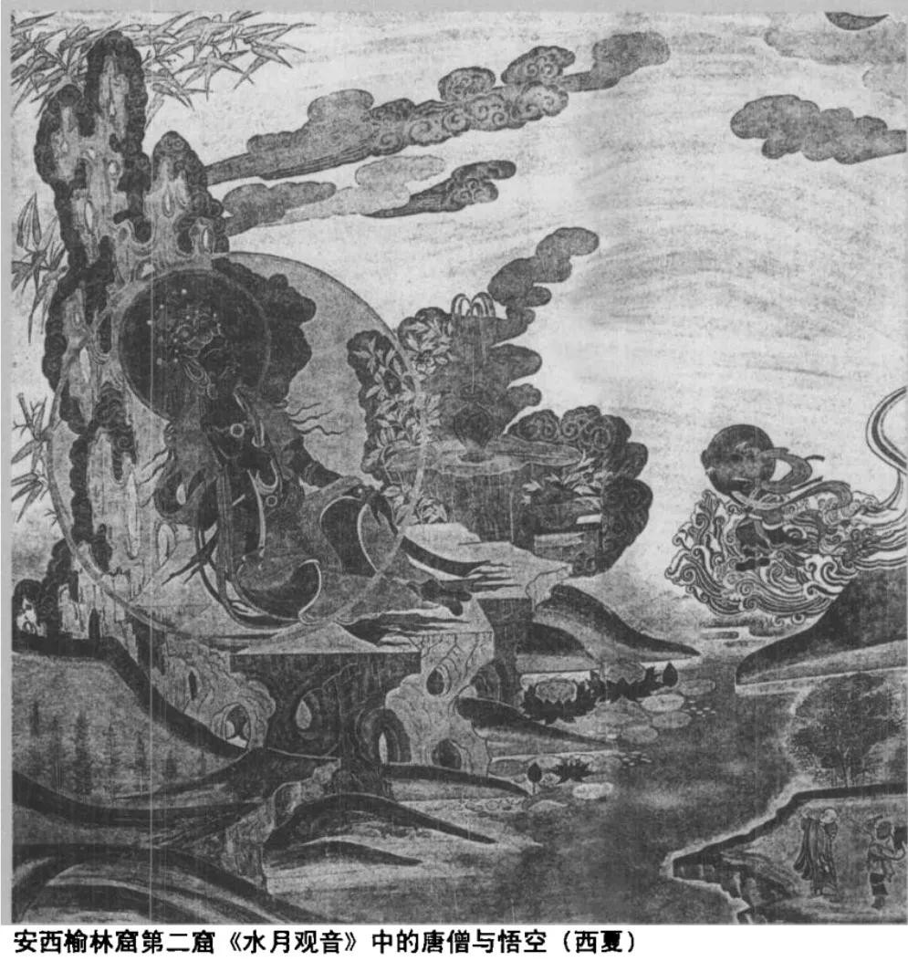 此图绘于该窟内前壁门北侧,纵148横146厘米。观音头戴宝冠,两肩披发,天衣严身,依山岩为"金刚宝座",前临清泉,后依修竹,左手抚膝,右手曲伸托净瓶。一轮新月升起。明月清风,莲荷轻浮,竹影婆娑。月光笼罩,玉宇清澈。观音前面的小丘上,一仙童子拥云腾空,遥相礼拜。右下角的小块陆地上,唐僧与孙悟空师徒二人停马伫立,昂首仰望,举揖行礼。这是已知现存最早的唐僧取经故事画。似描绘唐僧取经路上,受到观音的点化。他们师徒二人不畏艰险,在万籁俱寂的夜晚,昼夜兼程,突然迷失路径,仙童拥云腾空,禀报观音。这时水月观音显灵,乘坐瑞云在仙境中降临,为唐僧、孙悟空指点迷津,情景交融。这也是现知世界最早的孙悟空艺术形象。