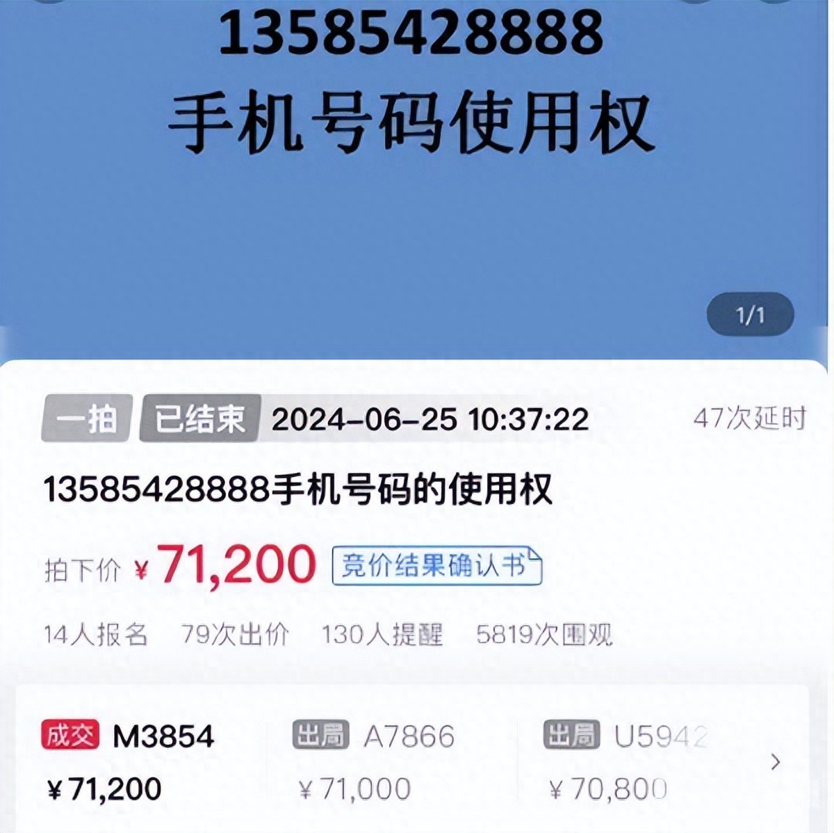 丁松林告诉记者:“尾数为‘8888’的手机号码在评估后,以11000元的价格在淘宝网进行司法拍卖。拍卖公告发布后,有5683次围观,133人设置提醒,14人报名,79次出价,最终该手机号码以71200元的价格成交,溢价56000余元,案款我们进行了分配,发放给了每一个申请执行人。”
