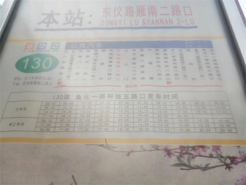 雁南二路东仪路口的130公交车站牌上已经印刷了定点发车时间表。