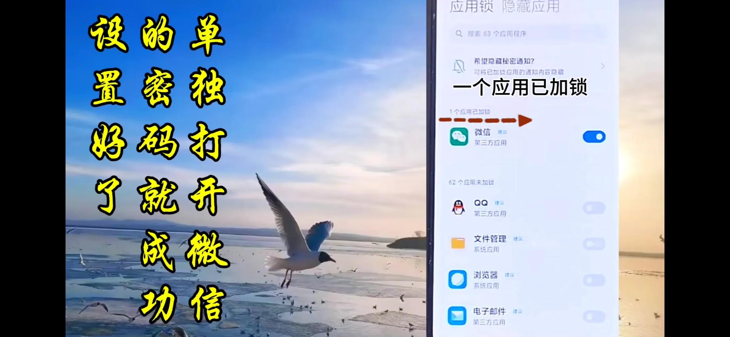 看到这一行字了没有:为应用加锁,保护隐私数据,第一次用的时候需要点击立即开启,请设置图案密码,那我们就输入一个图案,把图案密码输入两遍,你看这么多软件可以加锁,我们只选择微信,然后点击下方完成应用锁设置,在这里让立即验证指纹,我就来验证一下,这样单独打开微信的密码就成功设置好啦。