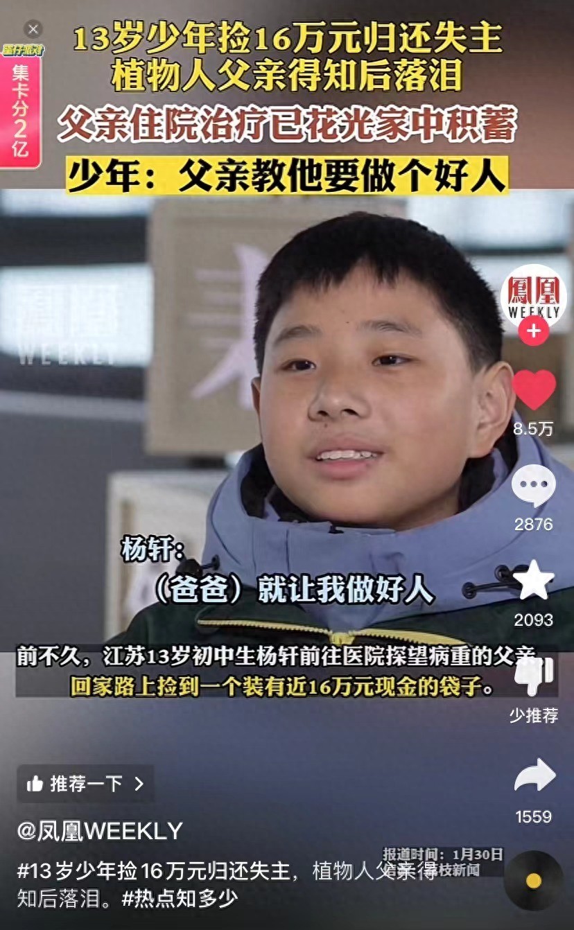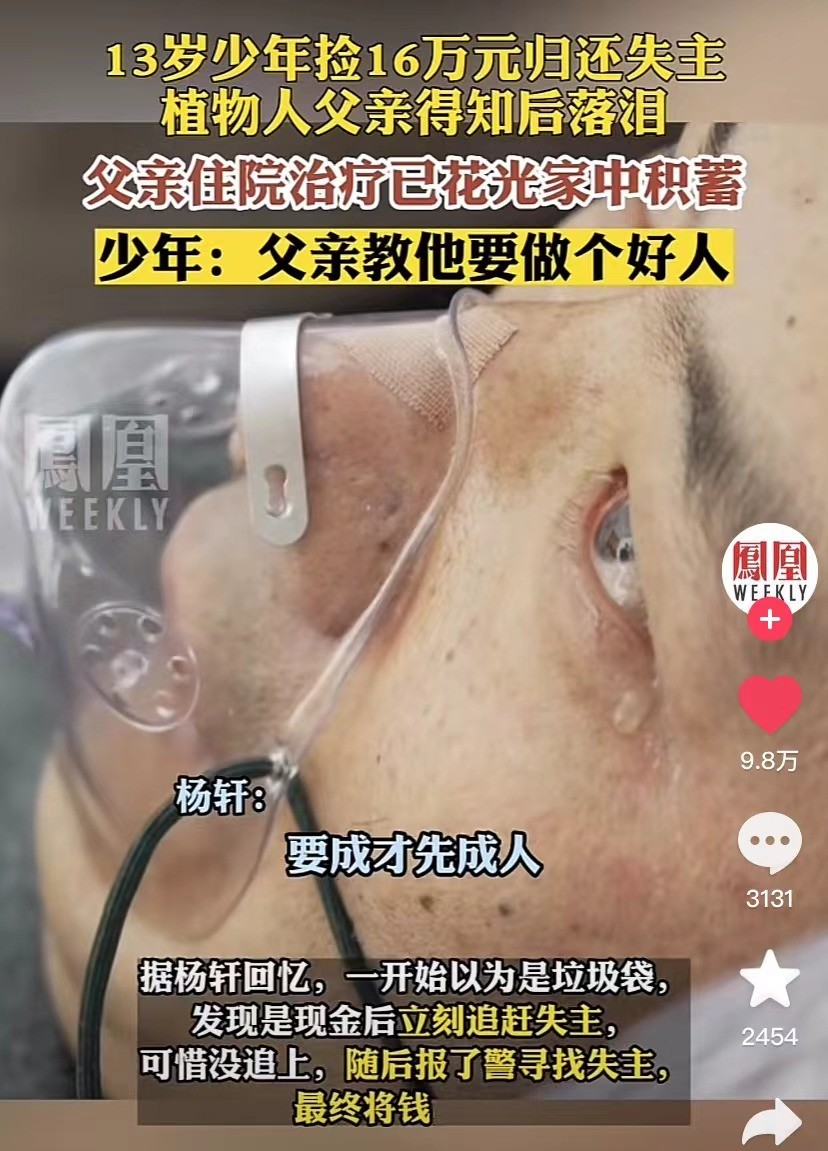 太可恨了!父亲病重的13岁少年捡16万现金归还失主,却遭网暴