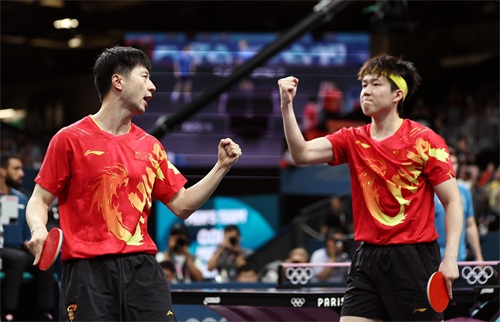 北京乒球名将马龙(左)、王楚钦在巴黎奥运会男团决赛中。新华社供图