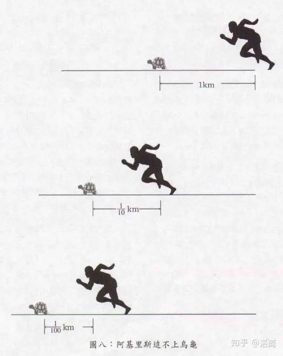 让乌龟在阿基里斯前面1000米处开始,和阿基里斯赛跑,并且假定阿基里斯的速度是乌龟的10倍。当比赛开始后,若阿基里斯跑了1000米,设所用的时间为t,此时乌龟便领先他100米;当阿基里斯跑完下一个100米时,他所用的时间为t/10,乌龟仍然前于他10米;当阿基里斯跑完下一个10米时,他所用的时间为t/100,乌龟仍然前于他1米…… 芝诺认为,阿基里斯能够继续逼近乌龟,但决不可能追上它。