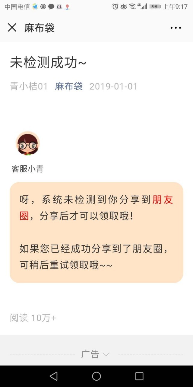 随后,记者根据链接点击进去发现,文章是由名为“一马止渴”的微信公众号发布,根据要求分享再点开后,会跳出一个名为“麻布袋”的公众号发布的名为《未检测成功~》的文章,文中写到“呀,系统未检测到你朋友圈,分享后才可以领取哦!如果您已经成功朋友圈,可稍后重试领取哦~~”记者反复重试了3次后,终于跳出一个“麻布袋”微信公众号发布的《领取教程》,但领取条件是要扫描文中提供的二维码,关注名为“爱物志”的微信公众号。记者一一按要求关注后,“爱物志”微信公众号终于发来一条消息,称记者成功获得青桔单车月卡,并附上小贴士称,摩拜、OFO、青桔等各大单车平台他们的长期合作伙伴。而当记者点击所提供的链接领取时,却以“此活动该城市暂未开放”为由领取失败。