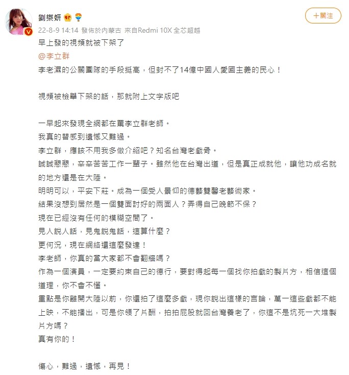 对于李立群的行为,刘乐妍也二度在微博怒轰,9日她先是在发文表示,指称李立群是知名的台湾老戏骨,“虽然他在台湾出道,但是真正成就他,让他功成名就的地方还是在大陆”。
