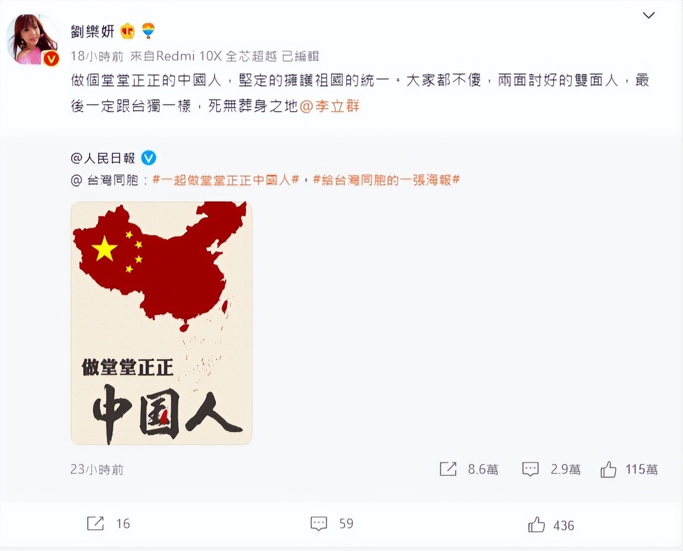 此外,刘乐妍昨日也在微博转发官媒《人民日报》“做个堂堂正正的中国人”的贴文,并表示“做个堂堂正正的中国人,坚定的拥护祖国的统一”,还不忘标记李立群狠酸“大家都不傻,两面讨好的双面人,最后一定跟台独一样没有什么好下场。