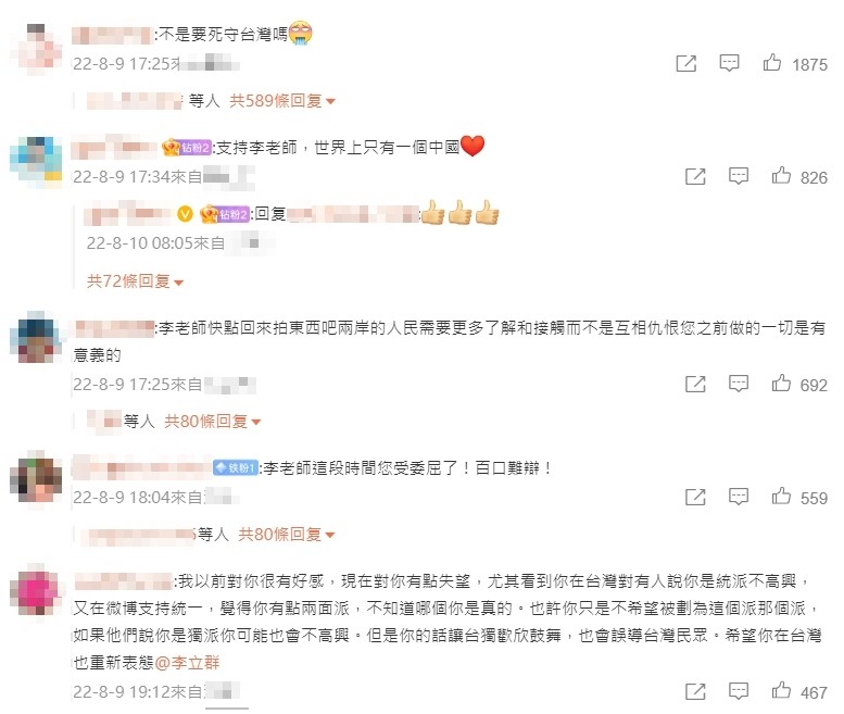 当时李立群没有在第一时间转发“只有一个中国”图片,而是一直到一周后才在微博转发,遭到一些网友炮轰,“这么多天才后知后觉,恐怕言不由衷”、“言行不一,为了钱可以没有人格两头骗,我看不起你”、“见人说人话,见鬼说鬼话,两头便宜都要占,可能吗?”、“李老师不愧是演戏的高手啊,佩服佩服”、“台湾信号挺差啊”。