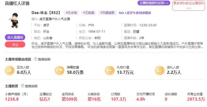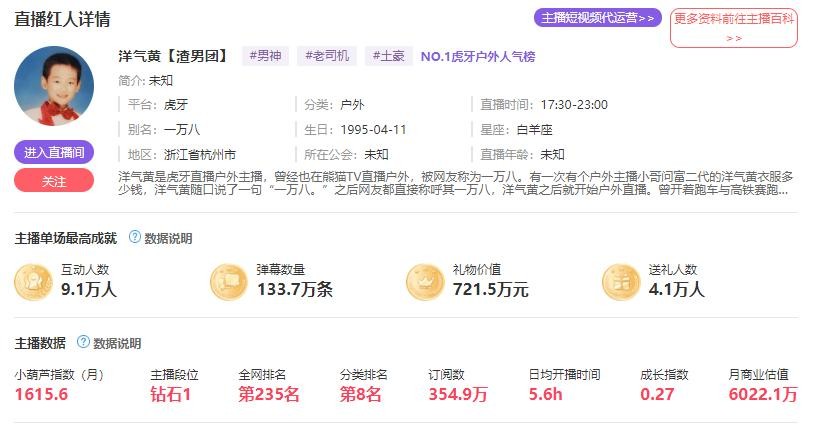 小葫芦数据统计,虎牙各大主播商业估值。在石排名娱乐版块第一位,商业估价一个亿!