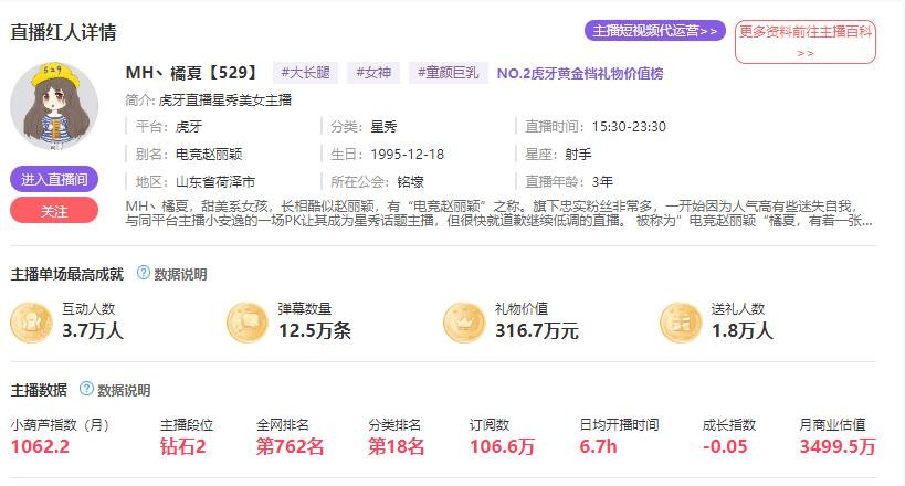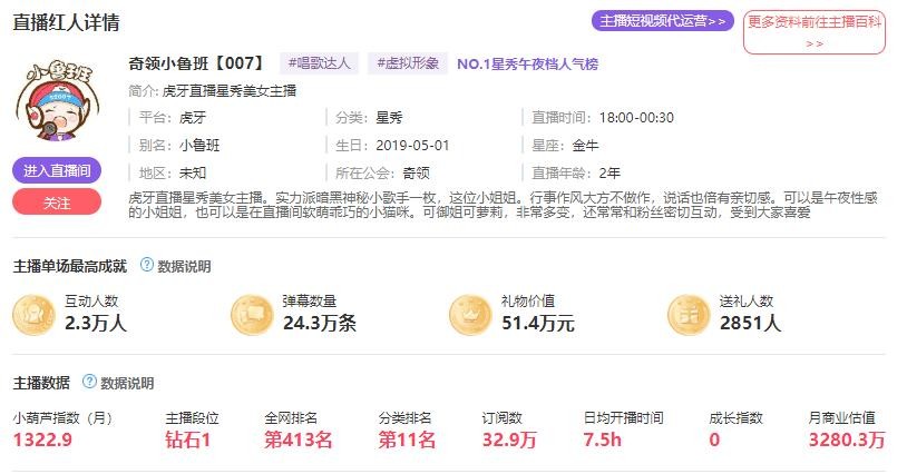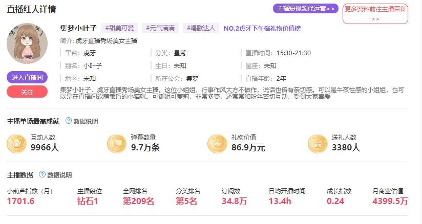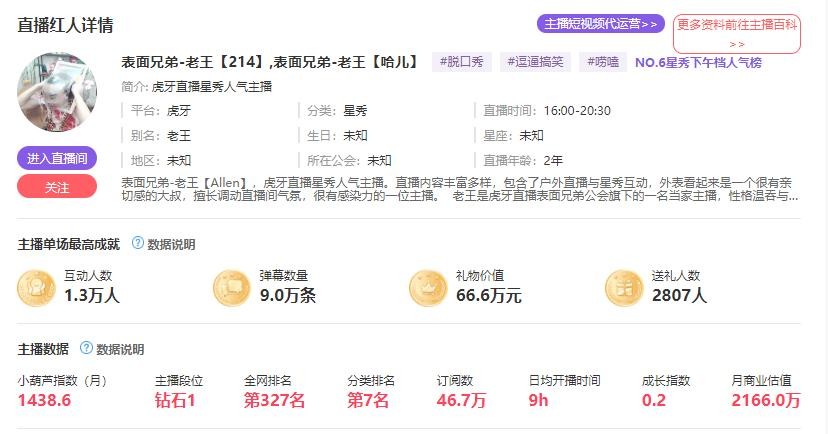 这两年,各个平台用头榜数据比较多。不过小葫芦数据的东西也是很全面,还有一条主播商业估值的数据。