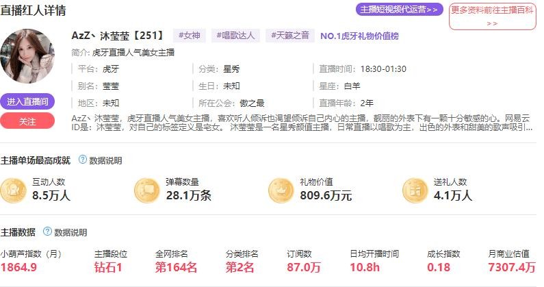 下面看看虎牙娱乐版块各大主播的商业估值情况。