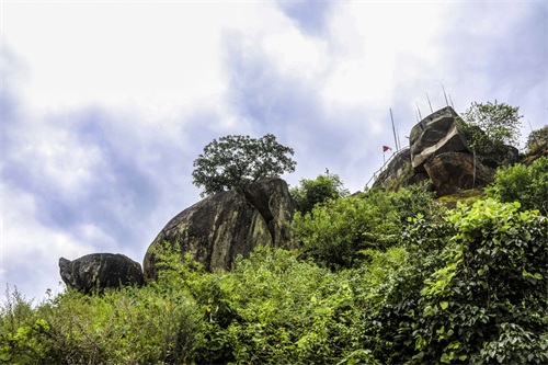 站在古寨的依偎的大山的脚下,人显得格外娇小。滑石古寨与梁平双桂堂遥遥相望,有“小华山”之称。滑石寨古寨是平坝上突兀拔起的一座高260多米的孤峰。孤峰呈纺锤形,四周皆是悬崖峭壁,峰顶平地有6000平方米左右。