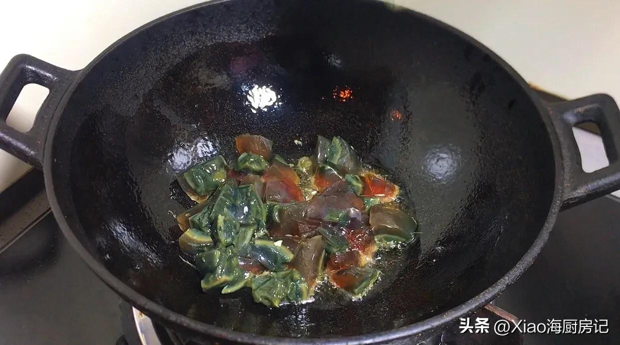 7.接下来我们把皮蛋用油煎一下 ,这样煎出来的皮蛋会更香 ,皮蛋煎香盛出