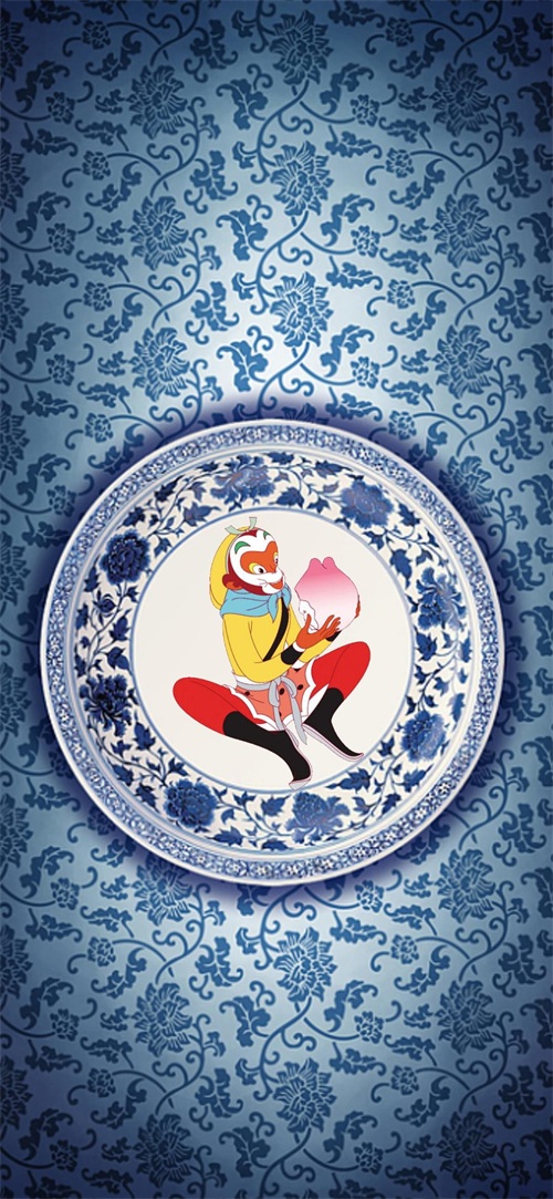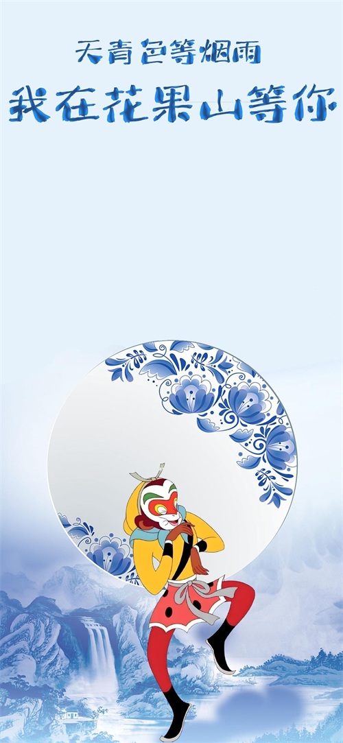下面这张壁纸,福图一刻在青花瓷山水及圆盘背景下,放置了“天青色等烟雨,我在花果山等你”的文字,在圆盘中放置了孙悟空动漫图片元素,寓意我们奋斗的轮回,此岸即彼岸。