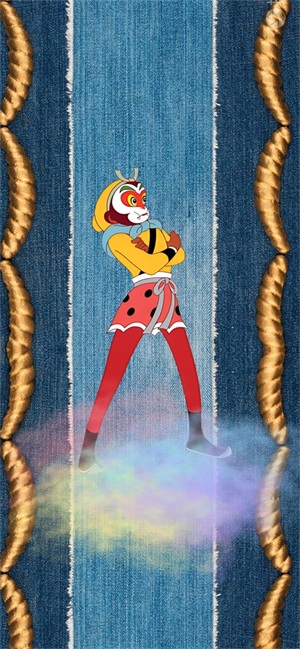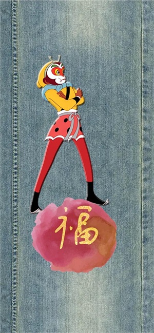 下面这张壁纸,福图一刻在牛仔布背景上放置了悟空元素,同时进行了立体化处理,仿佛是把悟空印制在牛仔布上的感觉。下面脚踩红色福字云团,寓意福在脚下。