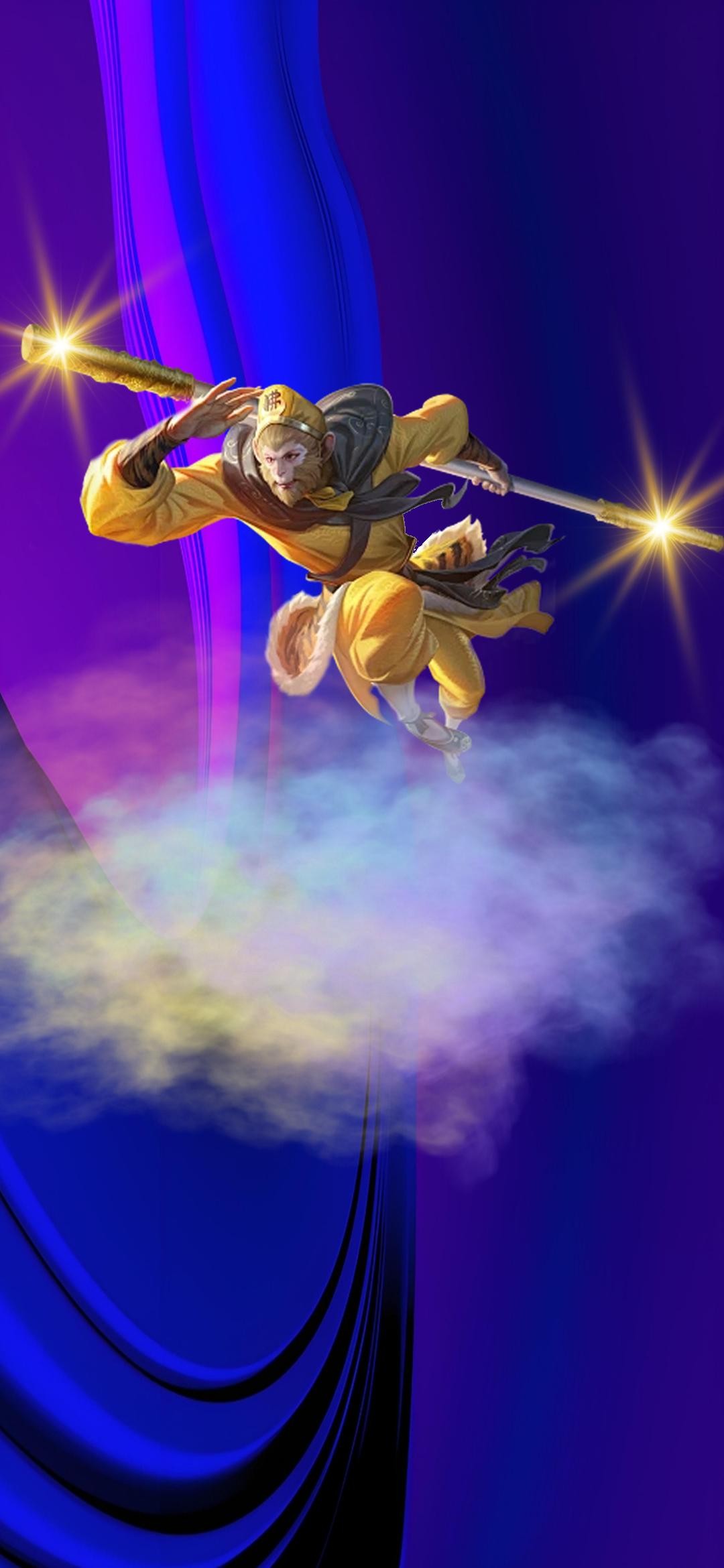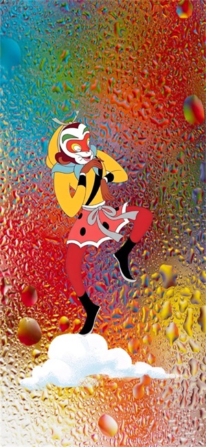下面这张壁纸,福图一刻用的是彩色水雾玻璃背景,也是我拼接而成的背景,放置了脚踩白云的悟空元素。